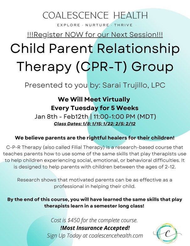 C-P-R Therapy (also called Filial Therapy) is a research-based course that teaches parents how to use some of the same skills that play therapists use to help children experiencing social, emotional, or behavioral difficulties. It is designed to help parents with children between the ages of 2-12.